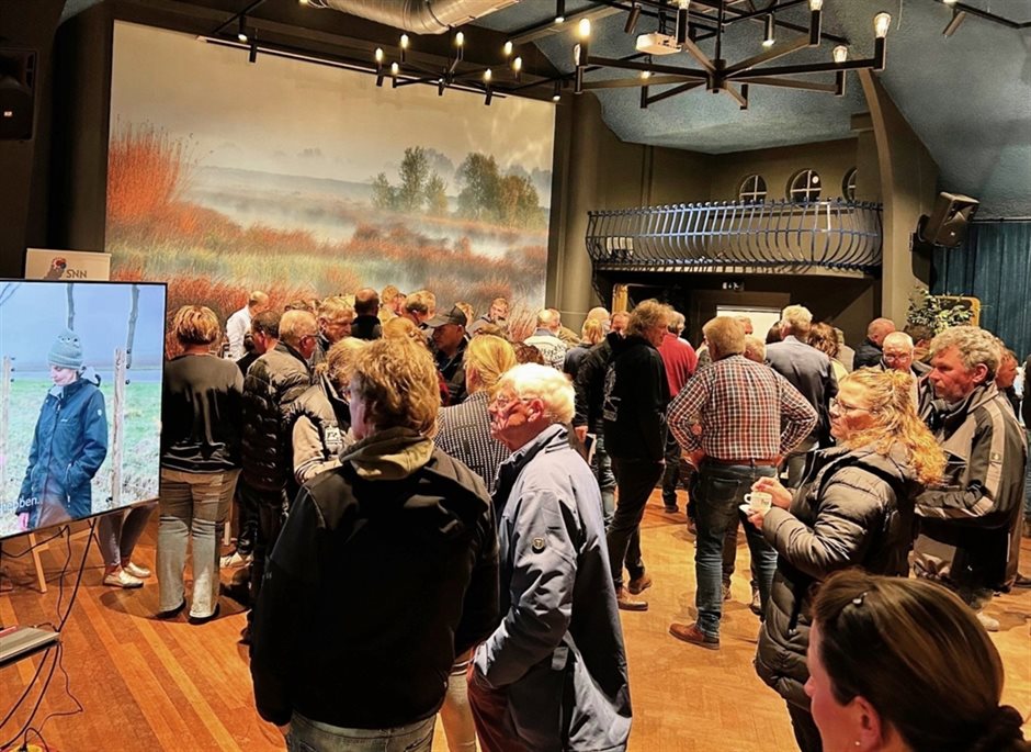 Een volle zaal in Grolloo tijdens de informatieavond over de subsidieregeling voor wolfwerende rasters. Veehouders uit de regio kwamen samen om informatie in te winnen over de bescherming van hun dieren tegen wolvenaanvallen. Gedeputeerde Egbert van Dijk was aanwezig om met hen in gesprek te gaan over hun ervaringen, rasters in het algemeen en de huidige praktijkproef in Drenthe in het bijzonder.