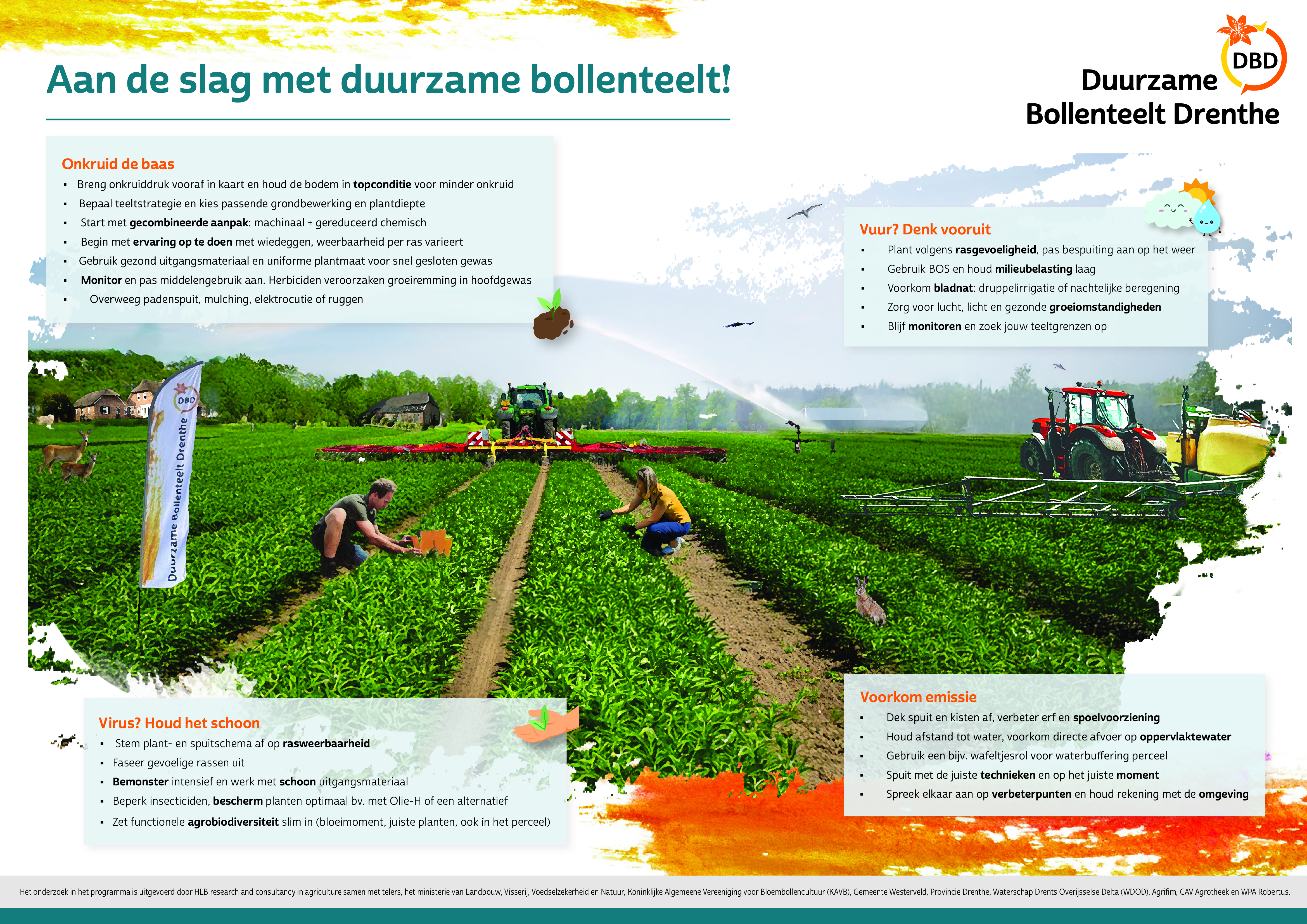 Het programma Duurzame Bollenteelt Drenthe gaf invulling aan het Uitvoeringsprogramma Toekomstvisie Gewasbescherming 2030 van het Ministerie van LVVN met drie pijlers: (I) ontwikkeling, kennis en verduurzaming, (II) dialoog tussen telers en omwonenden en (III) uitbreiding van het middelenpakket met minder milieubelastende opties. Duurzame Bollenteelt Drenthe is opgezet om te komen tot een meer duurzame lelieteelt met minimale milieu-impact. In de eerste plaats in de gemeente Westerveld, maar ook in Drenthe en op landelijke schaal. Binnen het programma is veel ervaring opgedaan in de praktijk, met experimenten en onderzoeken op verschillende proefvelden. Het onderzoek in het programma is uitgevoerd door HLB research and consultancy in agriculture samen met telers, Koninklijke Algemeene Vereeniging voor Bloembollencultuur (KAVB), Gemeente Westerveld, Provincie Drenthe, Waterschap Drents Overijsselse Delta (WDOD), Agrifirm, CAV Agrotheek en WPA Robertus.