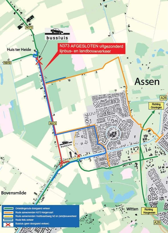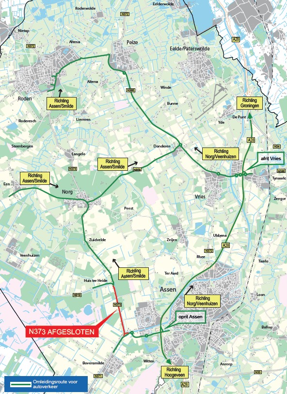 De provincie probeert de hinder voor omwonenden en weggebruikers te beperken. Helaas is extra reistijd onvermijdelijk. Verkeer wordt vanaf 24 november omgeleid via Norg, Donderen en Vries. Weggebruikers kunnen de route herkennen aan de gele borden langs de weg en kunnen de navigatie tijdelijk uitzetten.