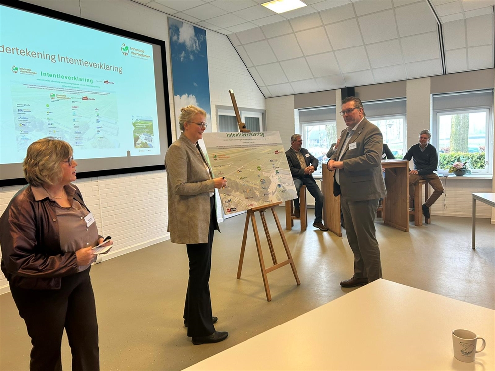 Marleen de Rond, Tanja Beuling en Gert-Jan Schuinder bij de ondertekening van de intentieverklaring Gebiedsprogramma Veenkoloniën.
