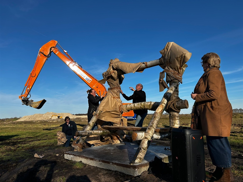 Stichting Beek en Veen onthult een bankje bij het startsein van de werkzaamheden Buffer Zuid, onder toeziend oog van Nynke Houwing, voorzitter Bestuurscommissie Bargerveen-Schoonebeek.